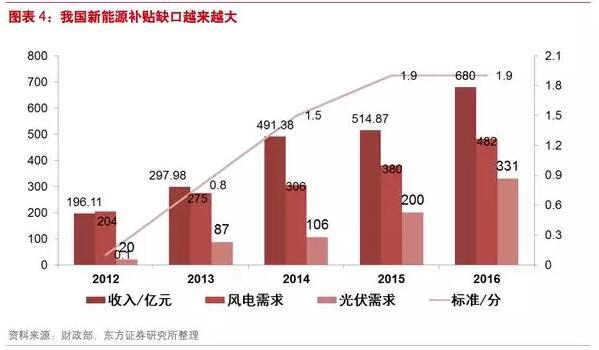 2016 年預(yù)計征收額可達到 1100 億元,但實際征收額不足 700 億元。隨著風(fēng)電及光伏發(fā)電行業(yè)上網(wǎng)電量不斷擴大,補貼基金面臨巨大的資金缺口。2016 年全年可再生能源電價補貼缺口超過 100 億元,累計缺口超過 600 億元。