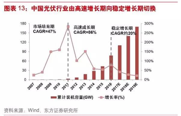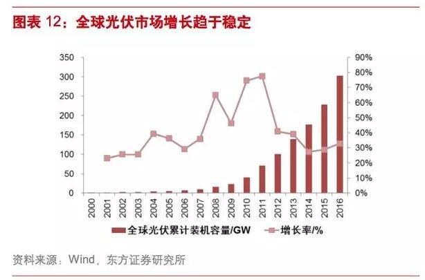 特別是 2012 年光伏產(chǎn)業(yè)遭受歐美“雙反”沖擊,國家出臺光伏的標桿電價制度,下游裝機容量迅速爆發(fā),行業(yè)進入高速發(fā)展期,從 2011-2016 年,國內(nèi)累計光伏裝機容量增長了 85 倍。