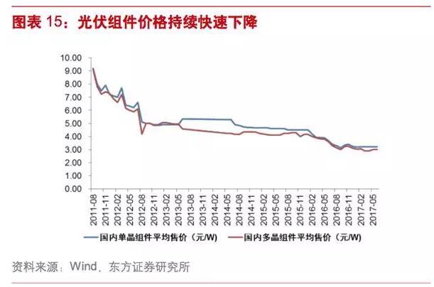 并于 2017 年下調(diào)三類地區(qū)光伏標桿電價至 0.65 元,0.75 元及 0.85 元,維持分布式光伏 0.42 元/kWh 的補貼力度。這些舉措充分說明國家引導(dǎo)光伏行業(yè)由政策扶植向市場主導(dǎo)轉(zhuǎn)移的決心。