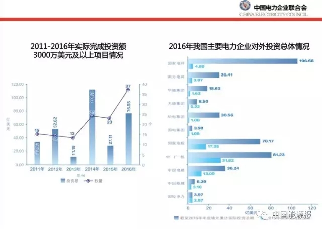 行業(yè)報(bào)告顯示,2016年,大型電力企業(yè)對(duì)外投資項(xiàng)目、新簽對(duì)外承包及年底在建合同額均較上年有所增長(zhǎng)?!耙粠б宦贰背蔀橥顿Y亮點(diǎn)。我國(guó)電力企業(yè)已在52個(gè)“一帶一路”沿線國(guó)家開(kāi)展投資業(yè)務(wù)和項(xiàng)目承包工程,其中大型承包項(xiàng)目120個(gè)、涉及國(guó)家29個(gè)、合同金額275億美元。