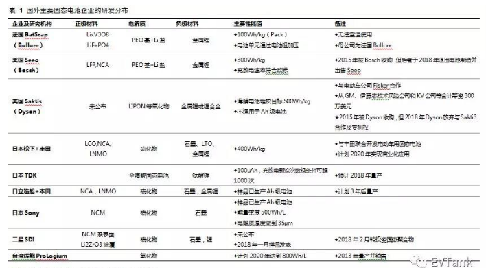 此外,三星、三菱、寶馬、現(xiàn)代、戴森等數(shù)家企業(yè)也都通過獨(dú)自研發(fā)或組合并購(gòu)等方式加緊布局固態(tài)電池的儲(chǔ)備研發(fā)。豐田宣布與松下合作研發(fā)固態(tài)電池;寶馬宣布與SolidPower公司合作研發(fā)固態(tài)鋰電池;博世與日本著名的GSYUASA(湯淺)電池公司及三菱重工共同建立了新工廠,主攻固態(tài)陽(yáng)極鋰離子電池;本田與日立造船建立的機(jī)構(gòu)已研發(fā)出Ah級(jí)電池,預(yù)計(jì)三年后量產(chǎn)。