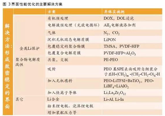 固體電解質(zhì)存在與電極間界面阻抗大,界面相容性較差,同時(shí)充放電過程中各材料的體積膨脹和收縮,導(dǎo)致界面容易分離等問題。使用鋰金屬負(fù)極也存在固相接觸阻抗大,界面反應(yīng),效率低等問題。目前解決的主要方向如下: