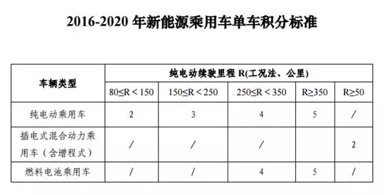2016和2017年度,對新能源汽車積分比例不做考核,2018至2020年,新能源汽車積分比例要求分別為 8%、10%、12%。2020年以后的比例要求另行制定。