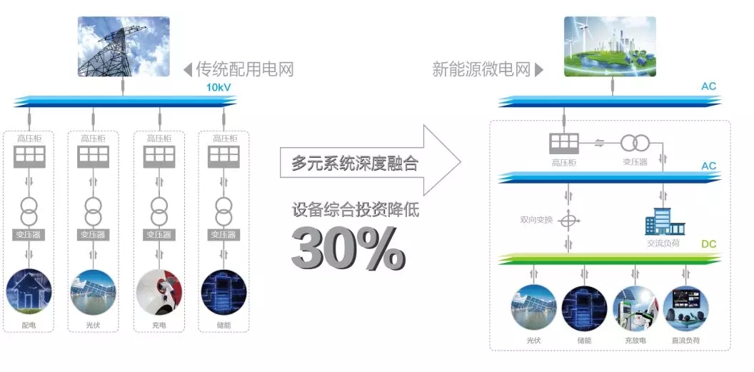 我們把配電、光伏、儲能、充電等電力電子設備高度集成,做到一個箱變里面,外面接10kv,配交流和直流兩條母線,交流的負載做到交流母線上,直流的負載做在直流母線上,這樣一個箱變就解決了四個箱變的問題,用一個箱變的投資代替四個箱變的投資,設備的綜合投資包括占地面積、集約程度都會有一個很大的進步,就會形成一個高度集成的系統(tǒng)。