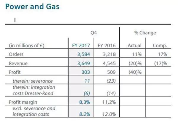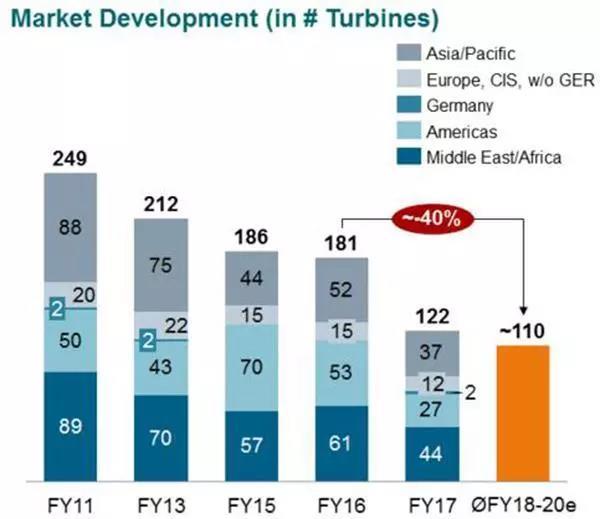 外界猜測,發(fā)電和天然氣集團(tuán)是“個別業(yè)務(wù)”的代表。2017年該業(yè)務(wù)表現(xiàn)最差,利潤下降至16億歐元。燃?xì)廨啓C(jī)(大于100MW)2017財年僅出售122臺,較2016年的181臺下滑32.6%。預(yù)計未來三年(2018-2020年)出售110臺。