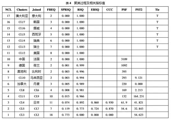 表4中,NCL為當(dāng)前系統(tǒng)存在類的總個數(shù),Clusters為當(dāng)前加入的編號,Joined表示加入該類的國家,F(xiàn)REQ表示新類的元素個數(shù),SPRSQ表示類與類之間規(guī)格化最短距離,RSQ表示R2統(tǒng)計(jì)量,ERSQ表示偏R2統(tǒng)計(jì)量,CCC為統(tǒng)計(jì)量值,PSF為偽F統(tǒng)計(jì)量,PST2為偽T2統(tǒng)計(jì)量,Tie表示“節(jié)”。從CCC統(tǒng)計(jì)量可以看出,聚為3類時的值最大;若聚為4類,偽F統(tǒng)計(jì)量PSF和偽T2統(tǒng)計(jì)量都變化較大。綜合各方面的情況,聚為3類最為合適。