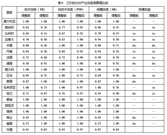對18個國家光伏產(chǎn)業(yè)效率的投入變量進(jìn)行調(diào)整后,再根據(jù)調(diào)整后的投入變量和原始產(chǎn)出變量,計(jì)算剔除了外部環(huán)境因素和隨機(jī)誤差的技術(shù)效率,如表3所示。與調(diào)整前相比,調(diào)整后的政策效率發(fā)生了變化。從18個國家光伏產(chǎn)業(yè)的平均效率值來看,技術(shù)效率從0.81上升到0.82,純技術(shù)效率從0.94上升到0.97,規(guī)模效率從0.87下降到0.84,波動的幅度較小??偟膩碚f,樣本國家的純技術(shù)效率在第一階段被低估,規(guī)模效率在第一階段被高估。