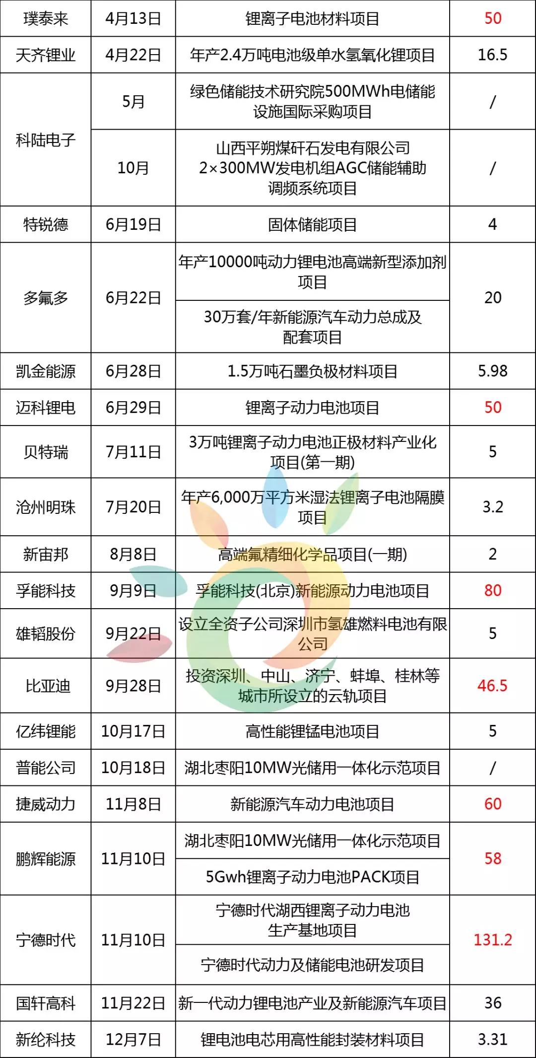 其中,寧德時代投資的湖西鋰離子動力電池生產(chǎn)基地項目和寧德時代動力及儲能電池研發(fā)項目,累計投資金額131.2億元,領(lǐng)跑鋰電行業(yè);其余投資超過40億元的企業(yè)有璞泰來、邁科鋰電、比亞迪、捷威動力和鵬輝能源。