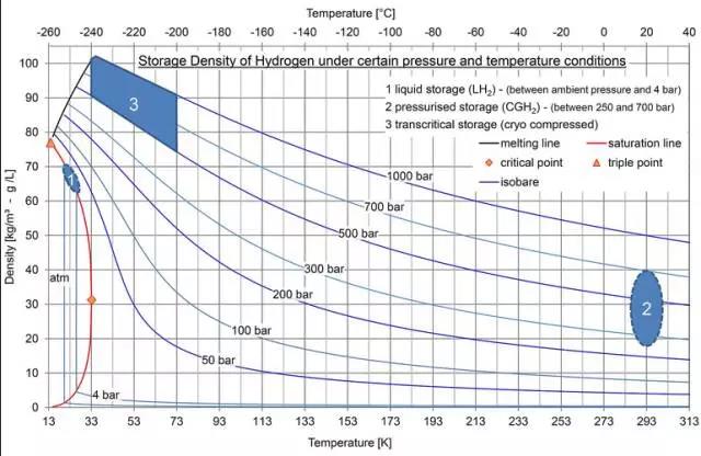 已被確認并被使用的氫氣儲存是經(jīng)由壓縮或液化的純氫儲存;常用的氫氣儲存是壓縮氫氣。隨著壓力的增加,氫密度隨之增加。圖3表示氫氣在不同的壓力和溫度的條件下儲存的密度。