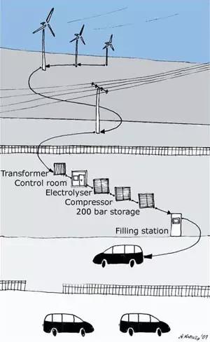 可再生能源如光伏、風(fēng)電場、海洋能等生產(chǎn)的電力是間歇性的、不穩(wěn)定的,而且多數(shù)在電力需求小的邊遠地區(qū)。如果能夠聯(lián)網(wǎng)直接供給消費地如沿海地區(qū),問題就簡單了,當其再生電力無法使用,于是產(chǎn)生“棄風(fēng)限電”這種現(xiàn)象。圖2表示風(fēng)電場產(chǎn)生的電力過剩,采用電解水產(chǎn)生氫,然后注入燃料電池汽車。電解生產(chǎn)的氫經(jīng)由壓縮機儲存在200 bar(1 bar=0.98692標準氣壓)的儲罐里,以便供應(yīng)給燃料電池汽車。