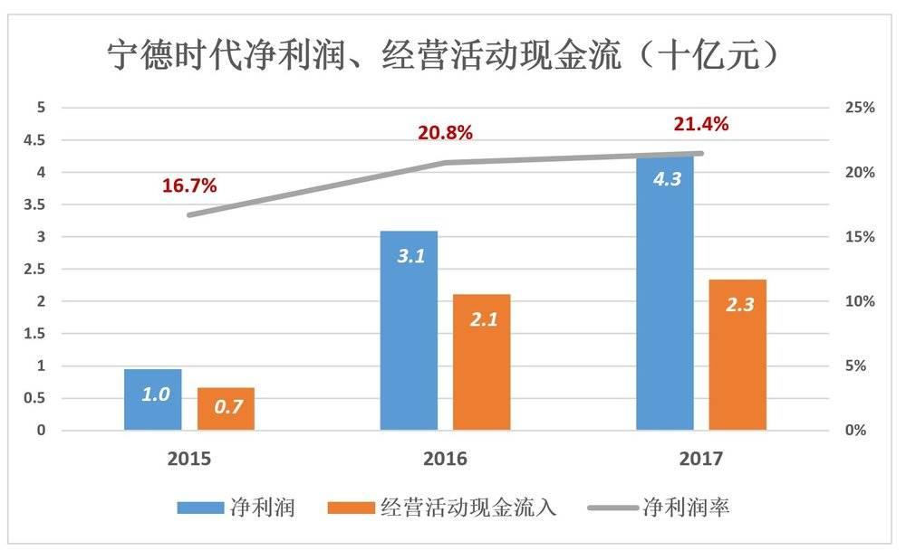 從凈利潤、凈利潤率及經(jīng)營活動(dòng)現(xiàn)金流入凈額看,寧德時(shí)代無疑是績優(yōu)股。2017年凈利潤率、經(jīng)營活動(dòng)現(xiàn)金流入凈額分別為43億和23億,凈利潤率21.4%。