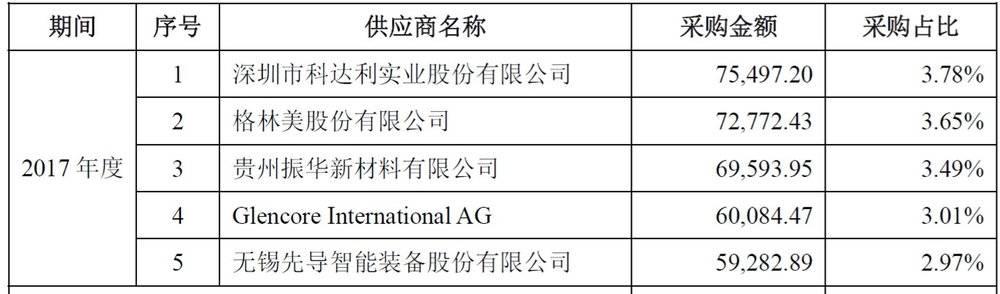 五大供應(yīng)商中,深圳科達(dá)利提供鋁制電池外殼、格格林美提供四氧化三鈷等原料、振華新材提供正極材料、Glencore International AG提供另一種正極材料(粗制氫氧化鈷)、無錫先導(dǎo)提供圈繞機(jī)和分條機(jī)。