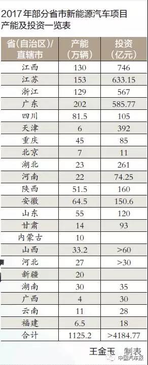記者對2017 年媒體報(bào)道過的新能源汽車投資項(xiàng)目進(jìn)行梳理后發(fā)現(xiàn)(詳見“2017 年部分省市新能源汽車項(xiàng)目產(chǎn)能及投資一覽表”),僅2017 年發(fā)布的全國各地的規(guī)劃產(chǎn)能就接近1200 萬輛,涉及投資4000 多億元,而這些規(guī)劃都是以2020 年為節(jié)點(diǎn)完成投產(chǎn)。再加上此前已經(jīng)得到國家發(fā)改委等有關(guān)部門審批的項(xiàng)目、既有的汽車制造企業(yè),新能源汽車的產(chǎn)能已經(jīng)遠(yuǎn)遠(yuǎn)超過了這個(gè)數(shù)字。甚至有專家稱,僅山東省就有40多家企業(yè)在制造新能源汽車。