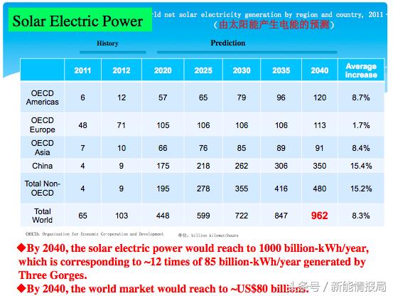 假如我們發(fā)展新能源,首先是太陽能,我們來看太陽能是什么樣的情況,這里列出的是在世界上不同范圍、不同區(qū)域從2011年到2040年太陽能產(chǎn)生電能的預(yù)測。我們可以看到到2040年,地球上的太陽能發(fā)出的電,每年有1萬億度電,相當(dāng)于三峽電站發(fā)電量的10—12倍。