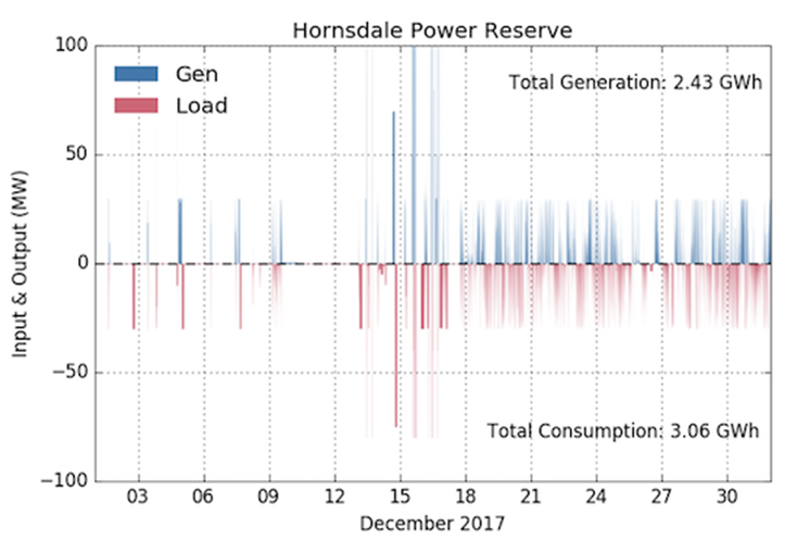 霍恩斯代爾電池儲系統(tǒng)在2017年12月產(chǎn)生了2.42吉瓦時(shí)的能源,消耗了3.06吉瓦時(shí)的電能。