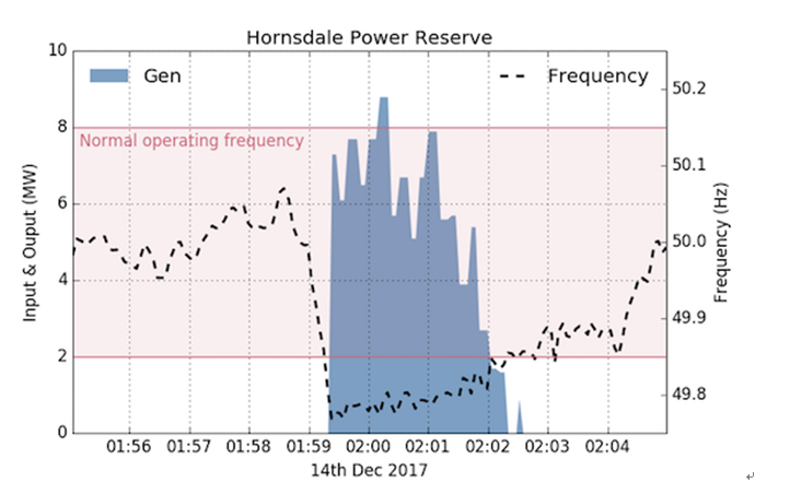 這是霍恩斯代爾能源儲備公司提供的服務(wù)之一。圖3顯示了霍恩斯代爾能源儲備公司如何應(yīng)對一起停電事件,其中一臺Loy Yang A在2017年12月14日停電。