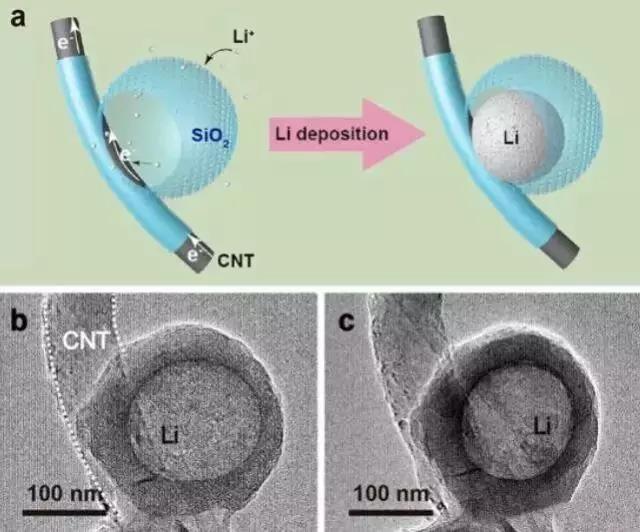 美國化學(xué)學(xué)會(huì)期刊(ACS journal)《納米快報(bào)》發(fā)表了一篇論文,研究人員采用空腔二氧化硅微球(hollow silica microspheres)結(jié)構(gòu),用于容納鋰離子,其碳納米管內(nèi)心可抑制枝晶生長(dendrite growth)。由于枝晶生長被抑制,在進(jìn)行200多次充放電后,其電極仍能保持高速鍍/汽提效率高達(dá)99%。