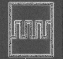 微型超級(jí)電容器:在顯微鏡中看到的這個(gè)薄膜碳超級(jí)電容器電極,大約每邊長(zhǎng)50微米。曲折多孔的地方是此裝置的活性區(qū)域。來(lái)源:閔憲