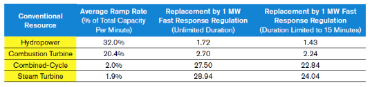 發(fā)電廠等傳統(tǒng)資源通過調(diào)節(jié)轉(zhuǎn)速響應(yīng)調(diào)頻信號,存在時間延遲。換句話講,電廠調(diào)節(jié)出力需要花費時間。儲能資源幾乎可瞬時調(diào)節(jié),既在一分鐘之內(nèi)實現(xiàn)100%的功率調(diào)節(jié)。2008年太平洋西北國家實驗室研究發(fā)現(xiàn)1 MW快速調(diào)節(jié)資源可提供等效調(diào)節(jié)服務(wù)為1.7 MW水力發(fā)電機(jī)組、2.7 MW的燃?xì)鈾C(jī)組和29 MW 燃煤機(jī)組。