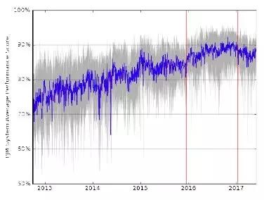 圖4顯示了PJM系統(tǒng)平均性能得分的變化情況。調(diào)節(jié)資源性能基于三個指標(biāo):準(zhǔn)確性、延遲性和精確度。準(zhǔn)確性是資源響應(yīng)調(diào)節(jié)信號的快慢;延遲性為從開始運動到達(dá)到預(yù)期的延遲時間;精確度是信號和響應(yīng)之間瞬時錯誤。