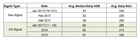 從利用經(jīng)濟(jì)手段保證系統(tǒng)可靠性的角度看,PJM這些市場規(guī)則調(diào)整改善了整體穩(wěn)定性。首先,2015年12月調(diào)整RegD估值系統(tǒng)和覆蓋率有效降低了維持ACE所需人為操作的次數(shù)(如圖5所示)。2017年調(diào)整信號系統(tǒng)有效降低了人為操作的必要性,由于不會再下發(fā)惡化ACE的信號了。其次,PJM通過引入新信號系統(tǒng)實現(xiàn)了ACE控制能力的提升。如表3所示,每日的ACE均值趨近于0,同時ACE的波動也減低了。這種ACE控制能力的改善表明了RegD資源響應(yīng)準(zhǔn)確性的降低被信號提升作用所抵消。