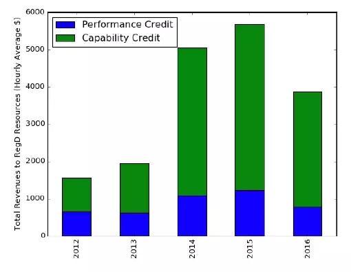 儲能調(diào)頻服務(wù)具有良好的精確性,但持續(xù)時間有限。近期PJM調(diào)整調(diào)頻規(guī)則是電力系統(tǒng)中精確性和持續(xù)性平衡的結(jié)果。調(diào)整后的市場規(guī)則能夠刺激各方在儲能開發(fā)和投資過程中更重視電量而不是功率。在條件中性新版RegD信號規(guī)則下,儲能能夠吸收或釋放更多能量將會獲得更高的性能得分。2016年P(guān)JM的性能合規(guī)經(jīng)理Eric Hsia解釋:“PJM中電池儲能的未來取決于技術(shù)進(jìn)步。如果電池儲能放電時間長于1小時,其想?yún)⑴c何種服務(wù)都可以”。然而,為了這些市場刺激能夠更有效,PJM需要調(diào)整估值系統(tǒng)以更好實現(xiàn)新信號規(guī)則的價值。