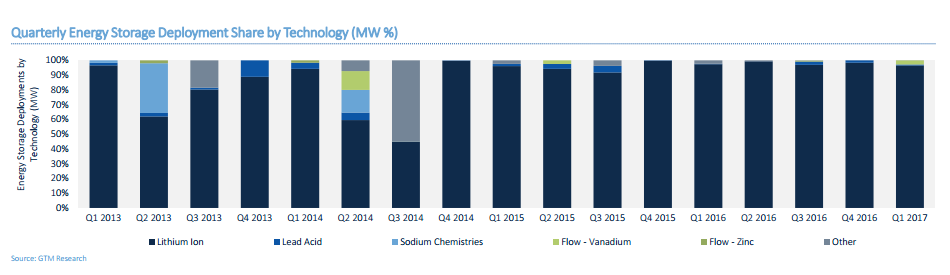根據(jù)發(fā)布的數(shù)據(jù)顯示,鋰離子電池仍占據(jù)儲能市場的主流地位,占2017年1季度儲能市場的96.5%,在用戶側儲能市場亦是占據(jù)主導地位。
