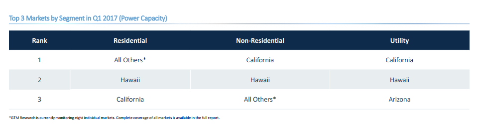 在2017年1季度,用戶側儲能安裝較2016年4季度降低了22%。同時,住宅用儲能市場發(fā)展相對平緩,環(huán)比降低了5%。相比之下,非住宅用儲能市場降低了26%,導致大幅下滑的主要原因是萬眾期待的下一階段的自發(fā)電激勵計劃(Self-Generation Incentive Program)在很大程度上造成了加州非住宅用儲能市場的急劇下降。