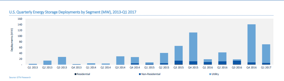 中國儲能網(wǎng)訊:日前,根據(jù)美國GTM研究所和美國儲能協(xié)會聯(lián)合發(fā)布的《美國儲能市場2017年監(jiān)測》數(shù)據(jù)顯示:在2017年1季度,美國儲能安裝量為71MW,較2016年4季度降低了50%(140.8MW),較2016年同期增長了276%(18.9MW)。