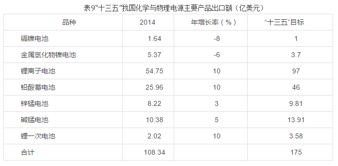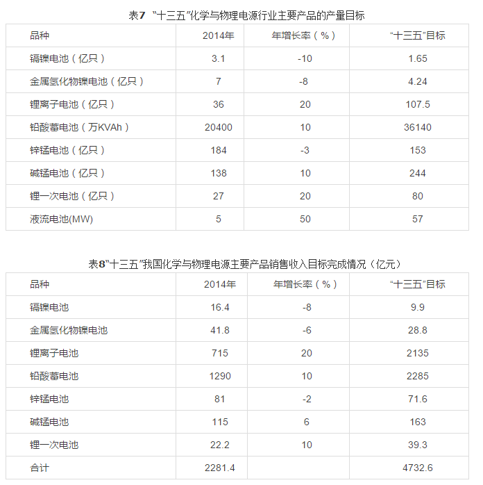 新能源產(chǎn)業(yè)作為國家“十三五”重點發(fā)展領(lǐng)域已無懸念,化學(xué)與物理電源產(chǎn)業(yè)是新能源產(chǎn)業(yè)的重要組成部分,“十三五”期間仍將保持持續(xù)、快速增長,其中傳統(tǒng)的化學(xué)電源將進入平穩(wěn)發(fā)展期,產(chǎn)業(yè)增長重點在“動力電池、儲能電池和傳統(tǒng)電池應(yīng)用”三大領(lǐng)域,增長貢獻率較大的主要電池品種有新發(fā)展IT、純電動車動力與儲能鋰離子電池和新型液流電池等;傳統(tǒng)汽車和新型汽車起停以及通信應(yīng)用鉛酸蓄電池(含鉛碳電池等)和不斷擴展應(yīng)用的鋰一次電池。2020年,我國化學(xué)與物理電源行業(yè)中的化學(xué)電源產(chǎn)品總產(chǎn)值將達到4000-5000億元左右,年平均增長率10-20%;鋰離子電池、鉛酸蓄電池將持續(xù)成為化學(xué)與物理電源行業(yè)的支柱產(chǎn)業(yè),鉛酸蓄電池保持平均8-10%增長,鋰離子電池年平均增長率20-30%;我國化學(xué)電源出口仍將保持持續(xù)快速增長的態(tài)勢,年平均增長率10-15%,出口品種增加,檔次提高,鋰離子電池將占出口總額的 55%以上?!笆濉蹦?,我國化學(xué)電源主要產(chǎn)品的產(chǎn)量、銷售收入和出口額目標(biāo)分別見表 7、8、9。