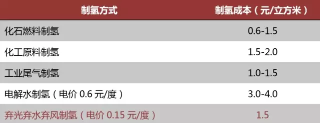目前棄光、棄風(fēng)和棄水發(fā)電的成本價(jià)格為0.15元/度,據(jù)此計(jì)算出的電解水制氫成本為1.5元/立方米,這已經(jīng)遠(yuǎn)低于利用上網(wǎng)電電解水制氫的成本,且與化石燃料(煤、焦炭和天然氣)制氫的成本上限接近(表1)。所以,未來氫能產(chǎn)業(yè)鏈下游儲(chǔ)運(yùn)等環(huán)節(jié)一旦取得突破,新能源支持的大規(guī)模電解水制氫的市場(chǎng)份額將出現(xiàn)增長(zhǎng),氫能成本也會(huì)進(jìn)一步降低。