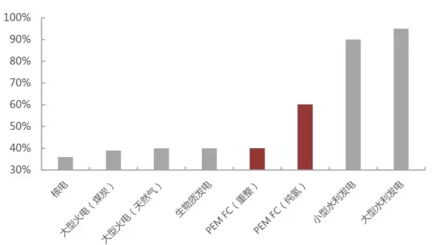 圖9:氫氧質(zhì)子交換膜燃料電池的發(fā)電效率約為60% 僅低于水利發(fā)電效率