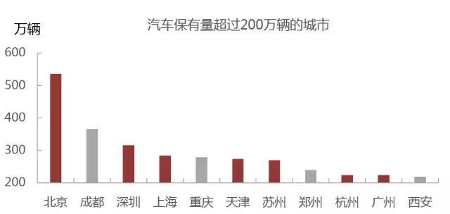 圖15: 2015年中國(guó)汽車保有量超過200萬輛的城市共有11個(gè),其中東部沿海城市占7個(gè)
