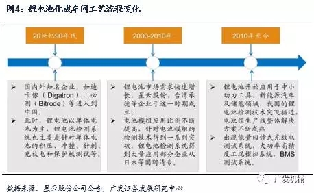 早在1980年代傳統(tǒng)的鋰電池檢測硬件系統(tǒng)就已經(jīng)面世,之后軟件系統(tǒng)成為傳統(tǒng)鋰電池檢測系統(tǒng)的重要補充,促進(jìn)了鋰電池檢測系統(tǒng)行業(yè)的發(fā)展。90年代隨著鋰電池應(yīng)用范圍進(jìn)一步擴(kuò)大,檢測技術(shù)快速發(fā)展,激活二次電池的化成設(shè)備開始規(guī)?;霈F(xiàn)。2010年之后新能源汽車和儲能應(yīng)用產(chǎn)品在國際范圍快速發(fā)展,行業(yè)進(jìn)入高速發(fā)展期,鋰電池檢測系統(tǒng)行業(yè)涌現(xiàn)出工況模擬系統(tǒng)、能量回饋系統(tǒng)和大功率檢測系統(tǒng)、BMS檢測等新一代產(chǎn)品,行業(yè)向自動化、系統(tǒng)化方向邁進(jìn),并且由離線選擇性測試向在線必需性測試轉(zhuǎn)變,需求大幅提升。目前后端設(shè)備形成了圍繞電芯激活化成、分容檢測以及電池組測試工藝的一系列設(shè)備。