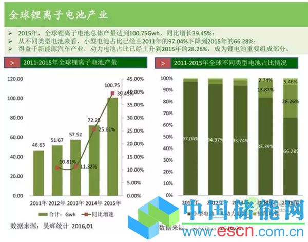 鋰電池材料下游需求主要在小型電池(消費電子)、動力電池(新能源汽車)、儲能等領(lǐng)域。根據(jù)統(tǒng)計,2015年全球鋰離子電池總產(chǎn)量達(dá)到了100.75Gwh,其中小型電池占比66.28%、動力電池占比28.26%、儲能電池占比5.46%,動力電池領(lǐng)域的占比對比2014年增長接近一倍: