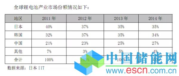 全球鋰電池產(chǎn)業(yè)呈現(xiàn)在東亞地區(qū)集聚的現(xiàn)象,中、日、韓三國幾乎占據(jù)了全球鋰電池市場所有的份額,但各國的產(chǎn)業(yè)重點并不相同。日本鋰離子電池產(chǎn)業(yè)的發(fā)展偏重于動力電池,其國內(nèi)動力型鋰離子電池份額已經(jīng)超過消費型鋰離子電池,占據(jù)了優(yōu)勢地位。與日本相反的是,韓國鋰離子電池產(chǎn)業(yè)與其本國三星、LG等消費類電子產(chǎn)品制造廠商緊密聯(lián)系,其更偏重于消費型鋰電池的發(fā)展,消費類電子產(chǎn)品類鋰電池仍占據(jù)其產(chǎn)量的較高份額。在中國市場,鋰離子電池產(chǎn)業(yè)一直保持穩(wěn)健的增長勢頭,我國鋰電池市場規(guī)模在全球市場的份額呈現(xiàn)逐年穩(wěn)步上升的態(tài)勢,年均增長率為2%,由2011年的21%逐步增長至2014年的27%,僅次于韓日兩國,為世界第三大鋰離子電池生產(chǎn)國。
