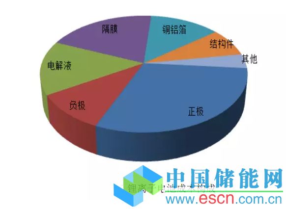 鋰離子電池的主要組成部分包括正極、負(fù)極、電解液和隔膜等,統(tǒng)稱為鋰電池四大材料,上述材料在電池成本中所占的比例不同。其中,正極材料占40%左右,電解液占16%左右,隔膜占21%左右,負(fù)極材料僅占5%。因此,可以說正極材料的成本直接決定鋰電池成本的高低。