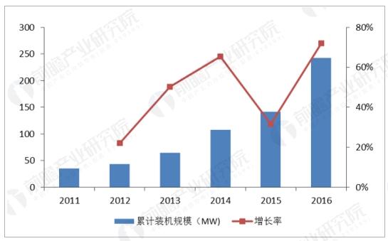 中國的儲能于2011年起步,近幾年保持著強(qiáng)勁的增長態(tài)勢,截至2016年底,中國投運(yùn)電化學(xué)儲能項(xiàng)目累計(jì)裝機(jī)規(guī)模為243.0MW,同比增長72%,新增裝機(jī)呈現(xiàn)加速增長的狀態(tài)。自2012年起,中國投運(yùn)的電化學(xué)儲能項(xiàng)目的累計(jì)裝機(jī)規(guī)模處于穩(wěn)步增長階段,年復(fù)合增長率(2012-2016)54%。2016年,中國新增投運(yùn)電化學(xué)儲能項(xiàng)目的裝機(jī)規(guī)模為101.4MW,同比增長299%。2016年新增規(guī)劃、在建中的電化學(xué)儲能項(xiàng)目的裝機(jī)規(guī)模為845.6MW,預(yù)計(jì)短期內(nèi)中國電化學(xué)儲能裝機(jī)規(guī)模還將保持高速增長。