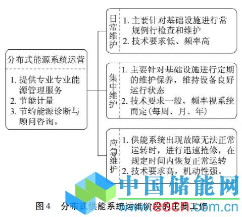 在分布式供能系統(tǒng)調(diào)試完畢,開啟計費周期時即進(jìn)入系統(tǒng)運維階段。分布式能源運維是確保供能系統(tǒng)安全、穩(wěn)定、高效運行,減少投資商經(jīng)濟(jì)損失的重要環(huán)節(jié),其主要包括產(chǎn)能設(shè)備、供能設(shè)施、通信系統(tǒng)等多個設(shè)備和系統(tǒng)的巡檢和維護(hù)管理工作,以及節(jié)能率測試、節(jié)能咨詢和增值服務(wù)等工作。總的來講,即是對整個供能網(wǎng)絡(luò)、系統(tǒng)、數(shù)據(jù)庫等軟件和硬件進(jìn)行日常維護(hù)、集中維護(hù)、應(yīng)急維護(hù),并對供能系統(tǒng)使用過程中業(yè)主的問題進(jìn)行答疑,能及時報告、排除、處理運營故障和事故,確保安全、可靠地供能。本著“預(yù)防為主、防治結(jié)合,防止供能中斷”的原則,分布式供能系統(tǒng)運維的主要工作內(nèi)容如圖4所示。