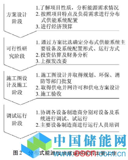 分布式能源投資建設(shè)階段的主要工作為:資金募集、分布式能源系統(tǒng)設(shè)備的采購、安裝和調(diào)試等,依次分為方案設(shè)計階段、可行性研究階段、施工圖設(shè)計及施工階段、調(diào)試運行階段,各階段的主要工作如圖2所示。