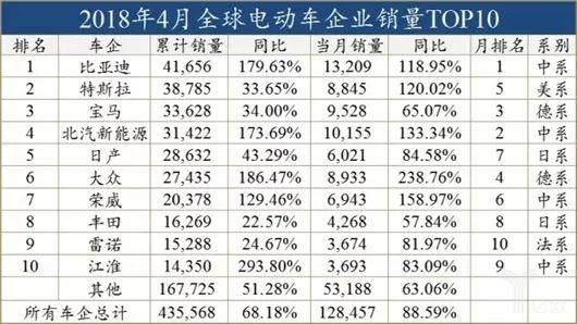 根據(jù)中汽協(xié)統(tǒng)計(jì),2018年4月,新能源汽車(chē)產(chǎn)銷(xiāo)分別完成8.1萬(wàn)輛和8.2萬(wàn)輛,比上年同期分別增長(zhǎng)117.7%和138.4%。其中新能源乘用車(chē)銷(xiāo)量同比大漲135.8%至71,872輛。而海外機(jī)構(gòu)統(tǒng)計(jì)數(shù)據(jù)顯示,2018年4月份,全球電動(dòng)乘用車(chē)(含純電動(dòng)車(chē)與插電式混合動(dòng)力車(chē))銷(xiāo)量同比激增88.6%至12.8萬(wàn)輛。也就是說(shuō),中國(guó)仍然占比超過(guò)50%。