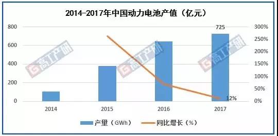 2017年中國動(dòng)力電池產(chǎn)值725億元,同比增長12%。動(dòng)力電池產(chǎn)值增速遠(yuǎn)低于產(chǎn)量增速,主要因?yàn)?017年政策調(diào)整,補(bǔ)貼力度大幅下滑,主機(jī)廠將部分成本壓力轉(zhuǎn)嫁到動(dòng)力電池企業(yè),使動(dòng)力電池價(jià)格大幅下滑。
