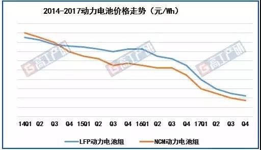 GGII數(shù)據(jù)顯示,2017年年底動(dòng)力電池價(jià)格較2017年初下滑20%~25%。磷酸鐵鋰電池組價(jià)格從年初的1.8~1.9元/Wh下降到年底的1.45~1.55元/Wh。三元?jiǎng)恿﹄姵匕鼉r(jià)格從年初的1.7~1.8元/Wh下降到年底的1.4~1.5元/Wh。