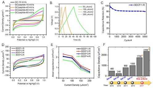 在此基礎(chǔ)上,研究人員進(jìn)一步研究了組裝材料的光學(xué)和電學(xué)性質(zhì)。在不同激發(fā)光照射下,多肽組裝體可以發(fā)出從藍(lán)色到紅色熒光。該材料在生物成像領(lǐng)域存在巨大的應(yīng)用前景。在電學(xué)測試中,在李舟指導(dǎo)下,研究人員探討了多肽組裝體作為超級電容器活性材料的儲(chǔ)能性質(zhì)。2009年,來自以色列的科學(xué)家首次報(bào)道了環(huán)狀苯丙氨酸二肽“納米森林”材料在儲(chǔ)能方面的應(yīng)用。該研究顯示了多肽材料具有良好的力學(xué)、電學(xué)性質(zhì),結(jié)合多肽納米材料較高的比表面積、合適的親疏水性,以及優(yōu)良的導(dǎo)電性質(zhì)等優(yōu)點(diǎn),多肽儲(chǔ)能成為了下一代柔性、可植入、輕質(zhì)、無污染儲(chǔ)能器件的潛在選項(xiàng)。在該研究中,研究者系統(tǒng)比較了四組多肽分子的電化學(xué)性質(zhì),結(jié)果表明多肽材料儲(chǔ)能大小可以通過多肽序列來調(diào)控。通過循環(huán)伏安法、恒流充放電等電化學(xué)測量手段,證明多肽材料具有良好的循環(huán)穩(wěn)定性、倍率性以及高于FF多肽材料的比電容性質(zhì)。
