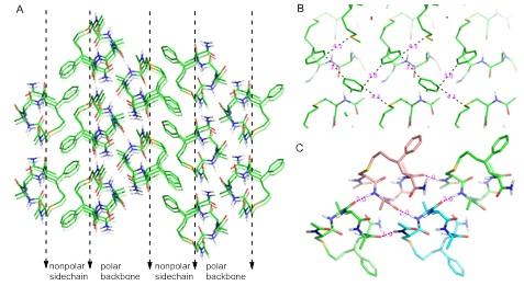 接下來他們對多肽自組裝的機(jī)理進(jìn)行了研究。通過與北京大學(xué)深圳研究生院兩個(gè)課題組的合作,對多肽組裝結(jié)構(gòu)進(jìn)行了晶型預(yù)測,得到了多肽分子的組裝模型。該模型顯示出了和實(shí)驗(yàn)結(jié)果良好的一致性。結(jié)果表明,多肽分子間的π-π相互作用,S-π 相互作用,以及氫鍵網(wǎng)絡(luò)驅(qū)動(dòng)了多肽分子的組裝。在多肽組裝體中,極性和非極性界面依次形成,且每兩個(gè)極性層的偶極子方向相反,這樣使組裝體內(nèi)部的偶極相互作用得以相互抵消,進(jìn)一步穩(wěn)定了組裝體。這也是該領(lǐng)域首次報(bào)道S-π 相互作用參與多肽自組裝的例子。