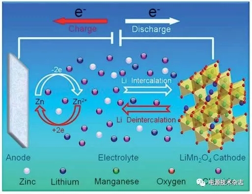 2012年, 本課題組以鋰離子脫嵌化合物為正極活性物質(zhì),金屬鋅為負(fù)積,以鋰離子和鋅離子水溶液為電解液,研發(fā)出一種全新的鋅基鋰電池體系。其充放電機(jī)理如圖1。充電時(shí),鋰離子從正極活性物質(zhì)中脫出,同時(shí)鋅離子沉積在負(fù)極金屬鋅表面。放電時(shí),鋰離子則從水溶液中插入到正極活性物質(zhì)晶格中,而負(fù)極的鋅離子重新溶解到水溶液里。不同于傳統(tǒng)鋰離子電池“搖椅式”的充放電機(jī)理,這個(gè)體系中鋰離子僅在正極發(fā)生脫嵌反應(yīng),避免了負(fù)極鋰脫嵌造成的水分解,顯著提高了電池的循環(huán)壽命。另外,采用金屬鋅作為負(fù)極能夠增加電池的能量密度,同時(shí)也降低了生產(chǎn)成本。作為一種高安全,無(wú)污染,長(zhǎng)壽命的新型儲(chǔ)能體系,鋅基鋰電池在不間斷電源,風(fēng)能/太陽(yáng)能存儲(chǔ),野外備用電池的等領(lǐng)域有著極強(qiáng)的應(yīng)用前景。本文針對(duì)鋅基鋰電池體系,主要從正極材料的選擇與優(yōu)化,電解液的適配,鋅負(fù)極的修飾等方面總結(jié)了近幾年我們課題組的優(yōu)秀研究成果,并對(duì)這一儲(chǔ)能體系存在的問(wèn)題,以及相應(yīng)的解決方案加以整理和展望。