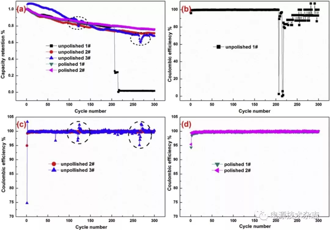 圖8 未拋光三種商用金屬鋅負(fù)極1#,2#,3#和拋光1#,2#鋅負(fù)極的循環(huán)性能(a)以及庫(kù)倫效率(b-d)