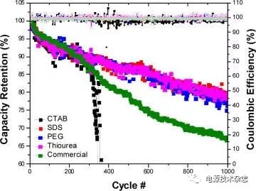 Kyung等用電鍍法制備了添加不同表面活性劑的鋅負(fù)極。X射線(xiàn)衍射(XRD)和掃描電鏡的結(jié)果表明,不同的添加劑(CTAB,SDS,PEG-8000,thiourea)能夠顯著影響鋅的結(jié)晶結(jié)構(gòu)和表面紋理。當(dāng)鋅具有強(qiáng)的(100)(110)衍射峰時(shí),枝晶更嚴(yán)重。而密集的表面紋路能夠有效抑制腐蝕,并顯著提升電池的浮充性能。17如圖9,經(jīng)過(guò)1000圈循環(huán),Zn-硫脲(thiourea)負(fù)極有著更高的容量保持率(80%),并且顯著優(yōu)于空白鋅負(fù)極(67%)。