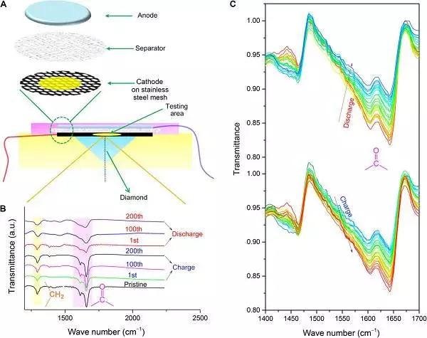 同時(shí),團(tuán)隊(duì)研究人員創(chuàng)新性使用靜電勢(shì)計(jì)算方法結(jié)合原位紅外、拉曼和紫外可見光譜等實(shí)驗(yàn)手段,研究推演了有機(jī)醌類材料在電池反過程中的活性位點(diǎn)以及結(jié)構(gòu)變化,闡明了鋅與柱[4]醌的結(jié)合發(fā)生在碗狀柱[4]醌分子上方的兩個(gè)羰基和底部的四個(gè)羰基上,拓展了電化學(xué)理論與實(shí)驗(yàn)結(jié)合新方法。該團(tuán)隊(duì)進(jìn)一步構(gòu)建了有機(jī)水系鋅全電池,基于醌正極材料和理論上使用的最低鋅負(fù)極質(zhì)量進(jìn)行計(jì)算,能夠提供220瓦時(shí)每公斤的能量密度,遠(yuǎn)超目前使用的水系鉛酸電池,也與目前商化化的鋰離子電池相當(dāng)。