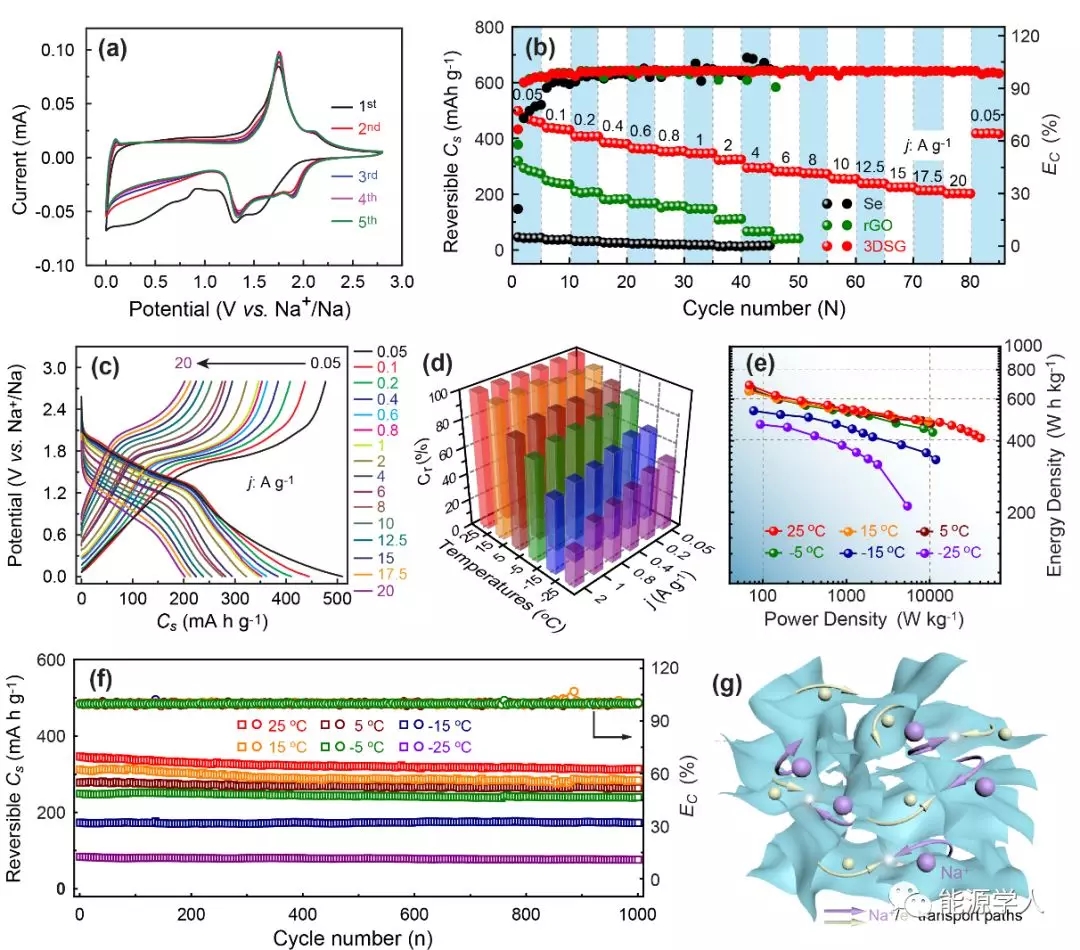 圖1.3DSG納米復(fù)合材料用作SIBs負(fù)極時(shí)的半電池電化學(xué)性能。(a)循環(huán)伏安曲線;(b)倍率性能對(duì)比;(c)不同電流密度下的充放電曲線;(d)容量保持率隨電流密度和溫度的變化情況;(e)在不同溫度下功率和能量密度之間的關(guān)系曲線;(f)不同溫度下電極的循環(huán)穩(wěn)定性(電流密度為2A/g)。(g)3DSG電極中Na+和e-的傳輸通路示意圖。